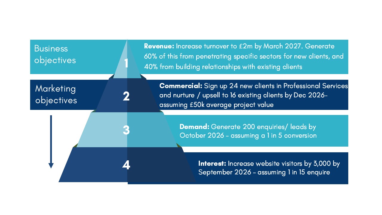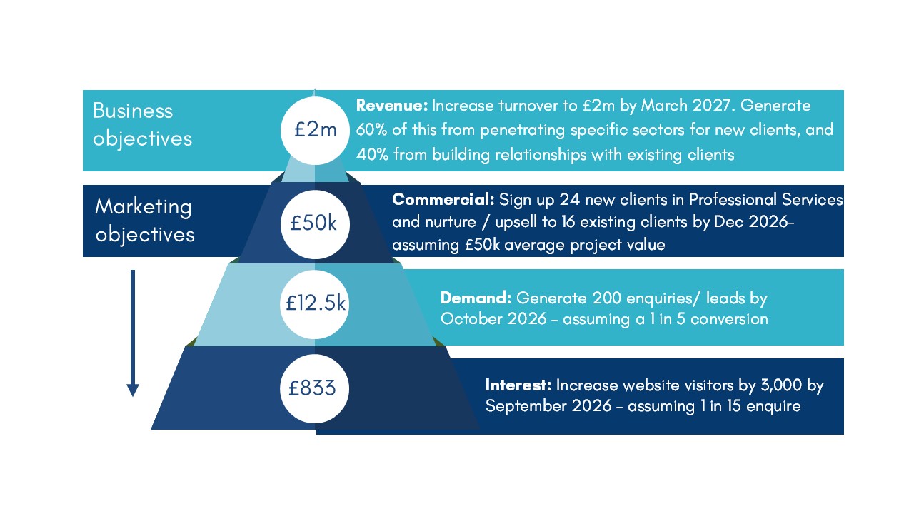 In this example, if the business objective is to increase turnover to £2m by March 2027 which translates to: 60% (£1.2m) from new clients in priority sectors and 40% (£0.8m) from existing client growth, every marketing objective below should be designed to deliver this.
